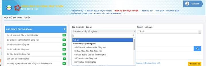 Bước 2: Công dân chọn cấp giải quyết (cấp Sở, cấp huyện, cấp xã), nhập tên thủ tục cần nộp và tiếp hành nộp hồ sơ